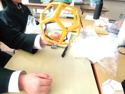 模型を使い班で組み立てながら正多面体について把握していく授業でした。がんばっていました。