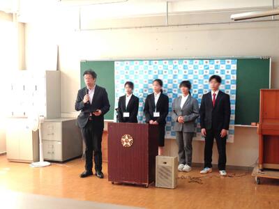 その後、本校で教育実習を行う4名の学生の着任式を行い、3年生代表生徒からの歓迎の言葉がありました。