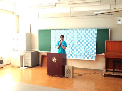 最初に生徒代表の2年生が挨拶し、「2学期は、港中祭に向けての生徒会活動や学習面に力を入れたい」との話がありました。自分の思いをしっかりと伝える姿がたいへん立派でした。生徒会役員として港中祭での活躍を期待しています。