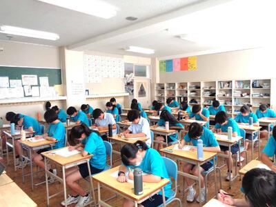 前期期末テスト2日目。今日は、実技教科、社会、英語、数学でした。学習の成果を発揮できたでしょうか。昨日より湿度は下がりましたが、まだまだ暑い中、よくがんばりました。