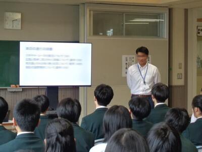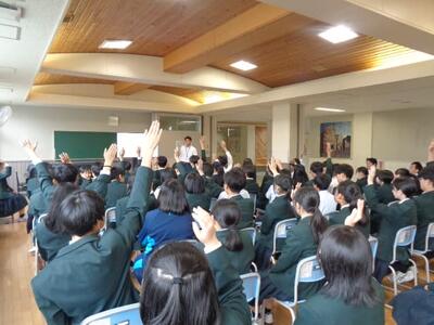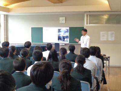 その後、本日来校した長崎大学工学部の学生さんからの講演でした。テーマは「平和な世界とはなんだろう?」。クイズ形式も取り入れながらの説明でした。話に対する3年生の反応、大変良かったです。