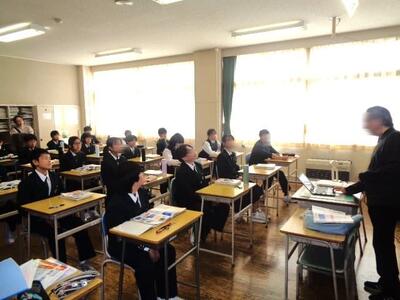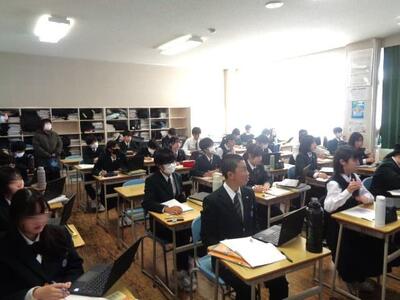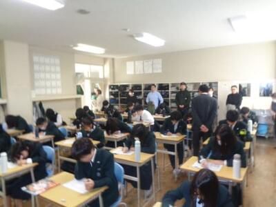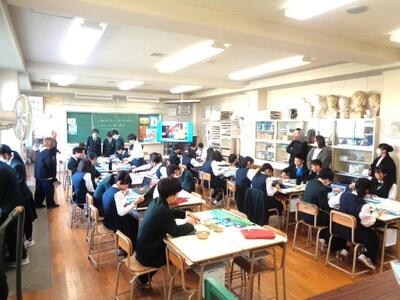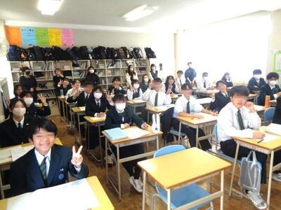 本日、今年度の「地域公開参観日」を実施しました。3時間目と5時間目の全学級の授業を公開し、日常の本校生徒の学習の様子をご覧いただきました。写真は上から1の1英語、1の2理科、1の3社会です。