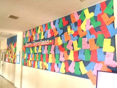 その代わりに、各学級でクリスマスに合わせた願いを一人一人書き、全校生徒分を玄関ホールに掲示しました。新生徒会総務の企画です。