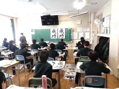 1年2組の書写の授業です。「成功」という文字を毛筆で書きます。