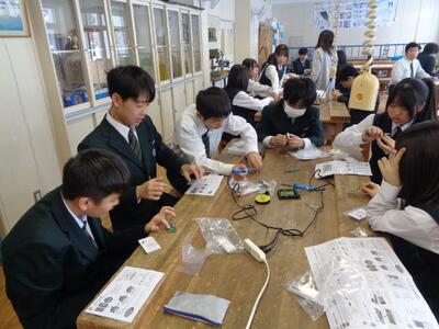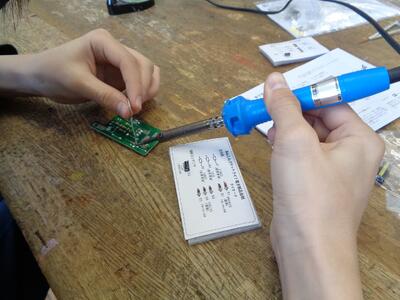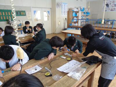 授業は、「はんだごて」の使い方の実践です。ブログ筆者も中学生の時、技術の時間、はんだごてでインターフォンを作ったことを思い出します。(昭和ですね・・・)