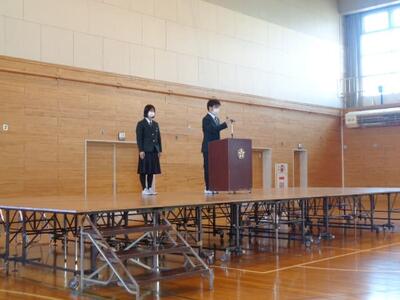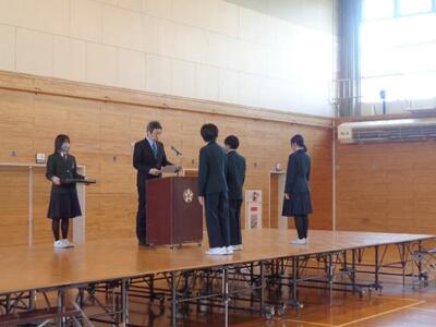 修了式では各学年とはまなす学級の代表生徒に、修了証書が渡されました。また各学年代表の生徒から、この1年の成果について発表がありました。